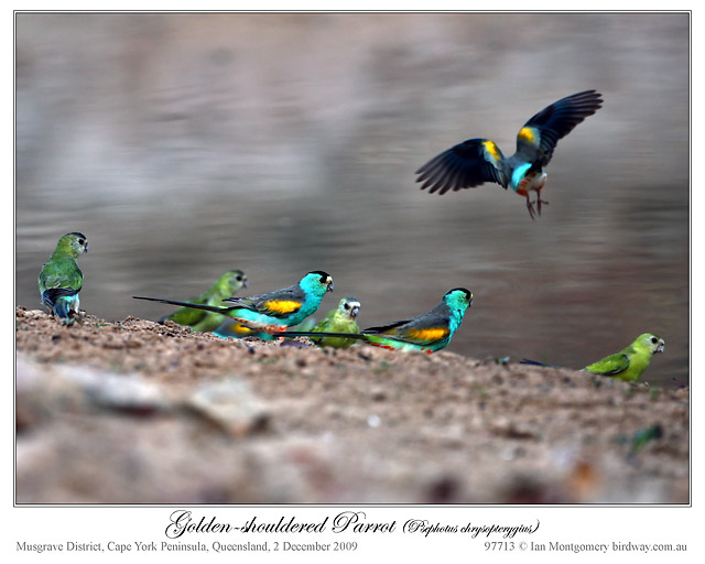 The two species look very similar. Male Golden-shouldered Parrots have narrower black caps, not extending past the eye, a yellowish forehead and, despite their name, a smaller golden patch on the wing. These shoulder patches are very obvious in flight, as in the bird top right in the first photo, and presumably act, along with the turquoise rump, as signals to other members of the species. At about 26cm/10in in length, these are both quite small parrots. Like the extinct, closely related, Paradise Parrot of southeastern Queensland, all three species nest, or nested, in terrestrial termite mounds.