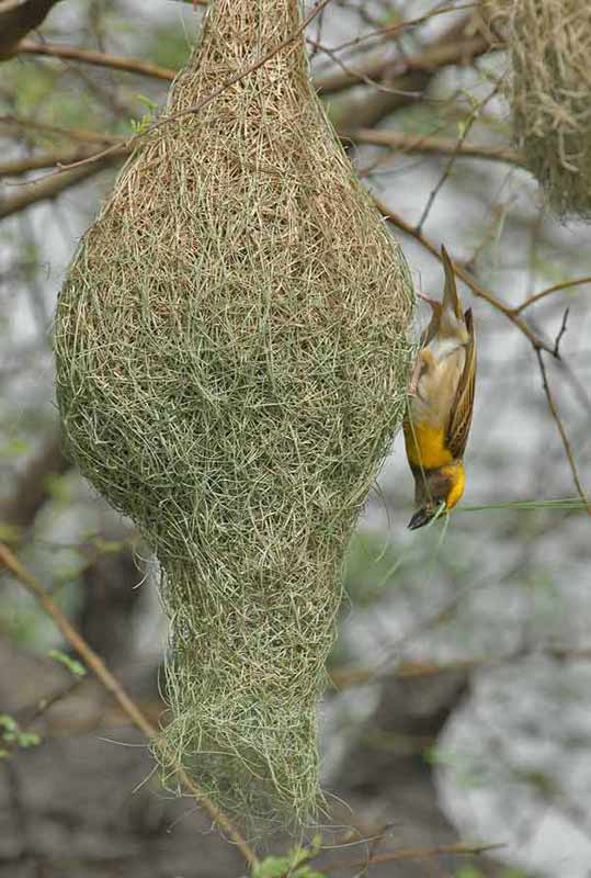 Baya Weaver nests in colonies of up to 20-30 pairs, usually in trees near freshwater and open ground. Their nests hang from a branch and look like an upside-down flask. A long tube leads to a side entrance, making it difficult even for snakes to enter the nest. Nests are made entirely out of strips of grass