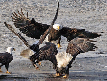 The highest concentration (most crowded gathering) of bald eagles in the world is in southeast Alaska, where the Chilkat River empties into the tidewaters near the town of Haines, a picture-postcard coastal town originally founded as a Presbyterian mission. At the Chilkat River’s emptying point more than 3,000 bald eagles congregate annually, during autumn, for an all-you-can-eat salmon feast. What do bald eagles like to eat? Bald eagles are hawk-like “birds of prey”, meaning that they like to eat meat from smaller animals (like fish) that they hunt and kill for food. Bald eagles especially like to eat salmon when then return to coastal streams and rivers during spawning seasons! (After salmon reproduce fertilized eggs for the next generation of salmon, the parents salmon are fatally exhausted (so tired out that they are dying) and they move about in shallow water where it is easy for bald eagles to see them and to grab them for food). If an eagle has an adequate food supply, which the eagles of Alaska usually do, they can live for twenty or thirty years, or may even live for forty years!