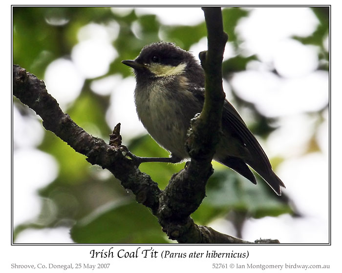 Here is a St Patrick’s Day special: one of only four avian species that are deemed to have Irish races, the Coal Tit. The Irish race, Parus ater hibernicus, has yellower cheeks and underparts and more cinammon flanks than its British counterpart britannicus.