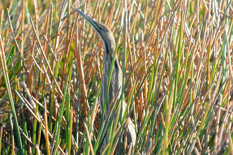 Bitterns belong to the Ardeidae- Herons, Bitterns Family and most are well hidden while they search for food. “Bitterns are a classification of birds in the heron family, a family of wading birds. Species named bitterns tend to be the shorter-necked, often more secretive members of this family. Bitterns usually frequent reed beds and similar marshy areas, and feed on amphibians, reptiles, insects, and fish. Unlike the similar storks, ibises, and spoonbills, herons and bitterns fly with their necks retracted, not outstretched.” (Wikipedia)