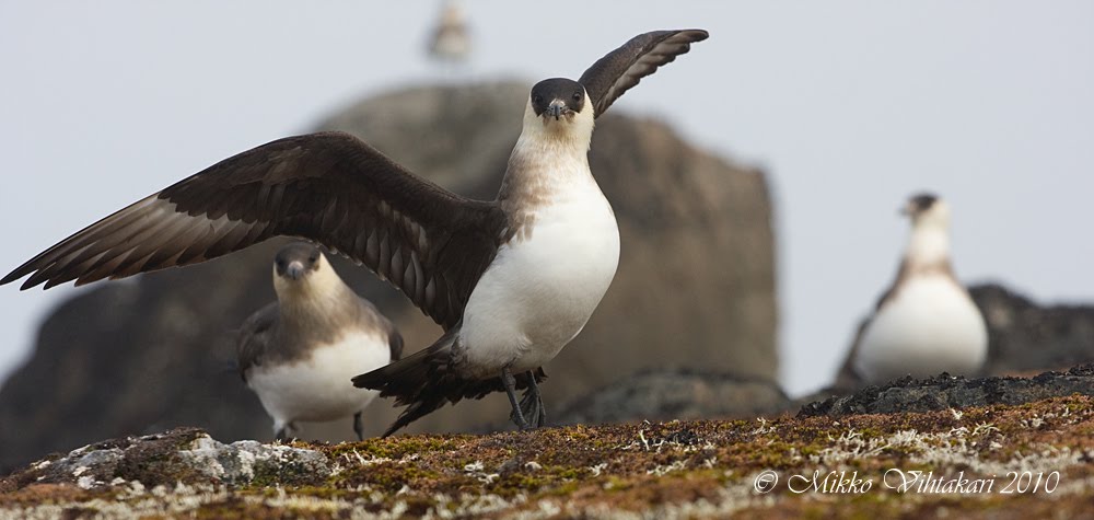 Arctic Skua (Stercorarius parasiticus). One of the tourist stops in Iceland is the world-famous geyser named Geysir – this is the namesake of all geysers, translating literally as “gusher”. (Iceland has been volcanically active for more than 1000 years, so geysers, fumaroles, and volcanic lava-flows are always foreseeable there.) Like Yellowstone’s “Old Faithful”, this famous geyser has lost power over the centuries, but it is still an impressive hydrothermal spring that intermittently expels boiling hot mineral waters from its surface vent. Near the gushing geyser Geysir, I saw Arctic Skua, a seabird that often frequents boggy tundra fields, especially damps heathland areas alogn island coastlands. [See Jürgen Nicolai, Detlef Singer, & Konrad Wothe, Birds of Britain and Europe (Collin Nature Guides, 2000; trans. By Ian Dawson) at page 122.] The Arctic Skua is rather aggressive, robbing other birds of their fish, and sometimes taking their nest eggs; skuas are also know to eats small rodents, such as mice. This skua is brown-winged, brown-legged, and brown-capped, but is otherwise mostly white, resembling a Common Gull in size and body shape, except its dark brown tail feather assembly has two pointed projections. If seen closely some yellowish tint accents its neck and cheeks. It is usually at sea except during the breeding season (May to July).