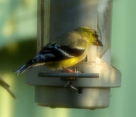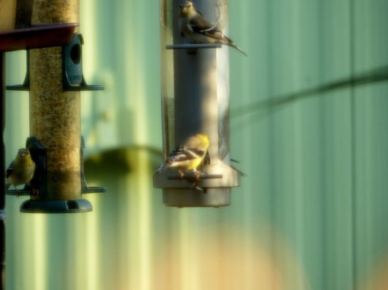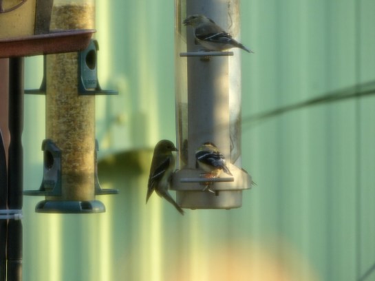 What a great surprise and blessing when I looked out the kitchen window this morning. Spotted an American Goldfinch at my feeder. Haven’t seen any in months. So it was neat to watch them. They kept coming and before long there were at least six. Went to get the camera when the first one showed up and recorded them as they kept coming in.
