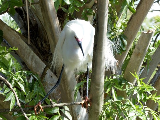 While walking around the rookery at Gatorland, we were able to view some Snowy Egrets at their nest. Dad was watching from above while mom was tending to the two baby “Snowies”.
