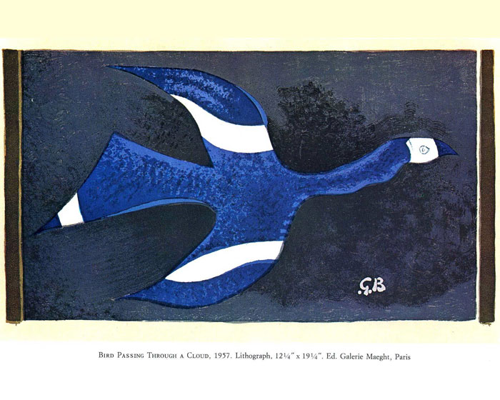 I think herons and egrets took wonderful in flight holding their necks in a dogs-leg angle. It makes them look delightfully primitive and remind me of the fantastic birds in flight painted by George Braque like the one below of a Bird Passing through a Cloud: this one even has a white face. When I took up bird watching at school in the early 1960s I also became fascinated by Braque’s birds – very fashionable then as he painted the one below in 1957. I did pottery at the time and painted imitations of his birds onto various rather shapeless objects.