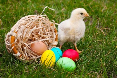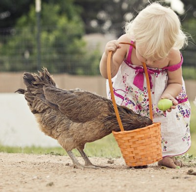 Mae grew very upset because she couldn’t find her eggs, so upset that she barely noticed a group of children gathering around a girl’s Easter basket. Mae started to walk past them, but she heard a small cracking sound, followed by cries from the children. Mae fluttered over to where the children stood and saw her eggs in the basket. One of the eggs was shaking while another was almost completely open. All of a sudden the egg hatched open to reveal a tiny chick. The chick peeped loudly and gazed at its new surroundings. Mae was so happy she started clucking noisily, and the children quickly drew back because they thought she was angry at them for accidentally taking her chicks, thinking they were Easter eggs.