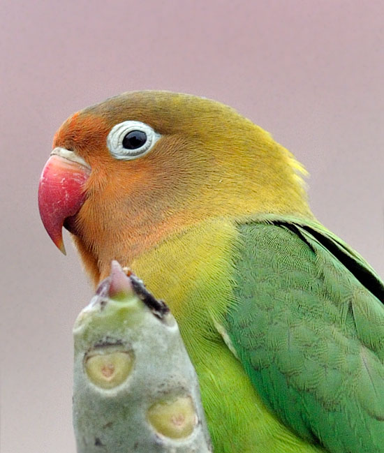 Lovebirds are 13 to 17 cm (5 to 7 in) in length and 40 to 60 g (1 1⁄2 to 2 oz) in weight. They are among the smallest parrots, characterized by a stocky build, a short blunt tail, and a relatively large, sharp beak. Wildtype lovebirds are mostly green with a variety of colors on their upper body, depending on the species. The Fischer’s Lovebird, Black-cheeked Lovebird, and the Masked Lovebird have a prominent white ring around their eyes. – Family Psittaculidae