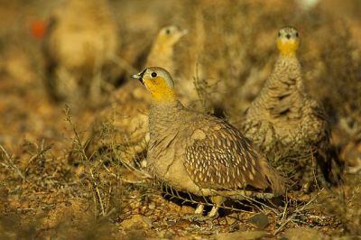 The crowned sandgrouse is a bird of deserts, preferring stony deserts rather than sandy ones. In North Africa breeds among dark red sandstone which matches its plumage colour. Avoids areas with too much vegetation. They are members of the Pteroclidae – Sandgrouse Family.