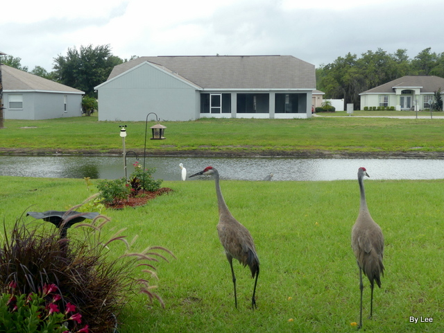 On the 16th, I was able to capture three different species through our door. We were having breakfast when they all appeared. A Great Blue Heron and Great Egret by the water’s edge and the two pesky Sandhill Cranes.