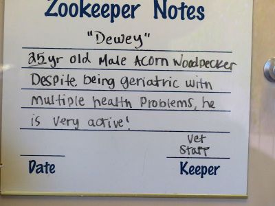 While on our vacation, we visited the Living Desert Museum and Rehab Center in California. One of the “rehab-ees” was an Acorn Woodpecker named Dewey. He is 25 years old and “despite being geriatric with multiple health problems, he is very active.