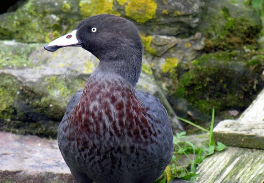 Blue Duck (Hymenolaimus malacorhynchos) is endemic to New Zealand. (Also known as “Whio”) It is the only member of the genus Hymenolaimus. It is an endemic resident breeder in New Zealand, nesting in hollow logs, small caves and other sheltered spots. It is a rare duck, holding territories on fast flowing mountain rivers. It is a powerful swimmer even in strong currents, but is reluctant to fly. It is difficult to find, but not particularly wary when located.