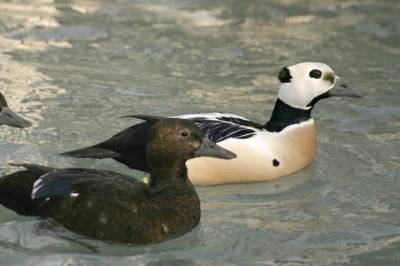 Steller’s Eider (Polysticta stelleri)is the smallest eider at 45 cm (18 in) long. The male is unmistakable with his white head marked by a thick black eye ring and greenish-black tufts of feathers on the forehead and the back of the head. Chin, throat and neck are also black, as are the back, tail, and rump. Wings are dark bluish-purple with white edging. When folded, they give a striped appearance across the back. The speculum is metallic blue bordered with white. The breast and flanks are cinnamon-buff marked with a black spot on each side just above the waterline. Legs, feet and bill are dark bluish-grey. The female is a dark brown bird, smaller with a more typically duck-shaped head and body than other eider species.