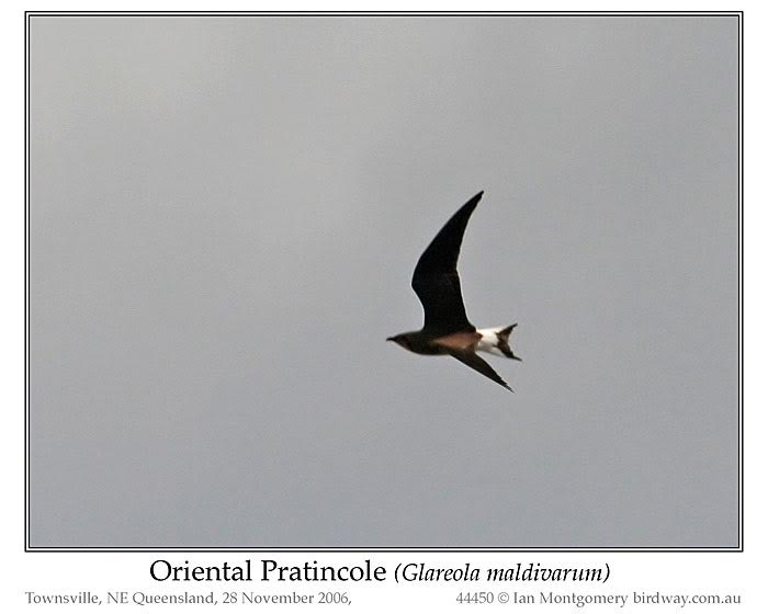I was at the opening of an excellent exhibition of North Queensland ‘breeding birds and their dream homes’ called Nestled at the Museum of Tropical Queensland in Townsville on Tuesday and got talking to one of the local members of BirdLife Townsville about the bird of the week. He requested something unusual of local interest that might occur here at this time of the year and mentioned Oriental Cuckoo and Oriental Plover. Oriental Cuckoo was bird of the week in December 2007 and I don’t have any good photos of Oriental Plover. I’ve only ever seen it in airports (Lockhart River and Norfolk Island) and I’ve never risked the wrath of airport security to get close to the birds. So the best I could come up with, Bill, is Oriental Pratincole photographed at the Townsville Town Common where a flock appeared nine years ago. I can’t get more local than that!