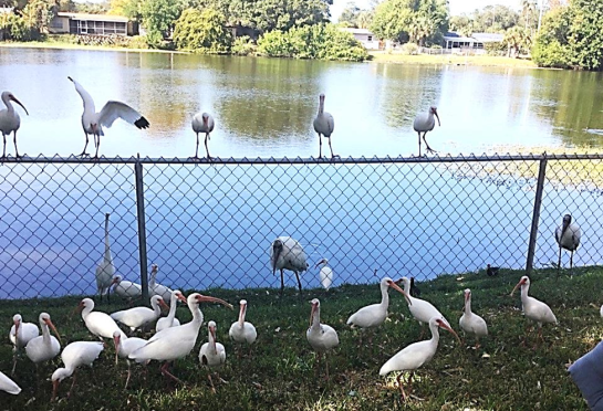 White Ibis. Although wild, these happy-to-eat-bread birds are noticeably bold in their willingness to approach humans who feed them bread crumbs. (In some Florida pond-shore park contexts they will literally eat bread morsels from human hands.) White Ibises are a long-legged chicken-sized waterfowl, almost all white (yet has black under-edging on its wings), with a long decurved (i.e., downward-curved) bill that is reddish (vermillion-orange/coral-red) in color. These wading birds enjoy eating critters that inhabit pond-shore waters, such as crayfish, small fishes, and aquatic insects. [See John Bull & John Farrand, Jr., NATIONAL AUDUBON SOCIETY FIELD GUIDE TO NORTH AMERICAN BIRDS: EASTERN REGION, revised edition (New York, NY: Alfred A. Knopf, 1994), pages 12 & 376.] These white waterfowl are known to hybridize with Scarlet Ibis. [See Eugene M. McCarthy, HANDBOOK OF AVIAN HYBRIDS OF THE WORLD (Oxford, UK: Oxford University Press, 2006), page 192.]