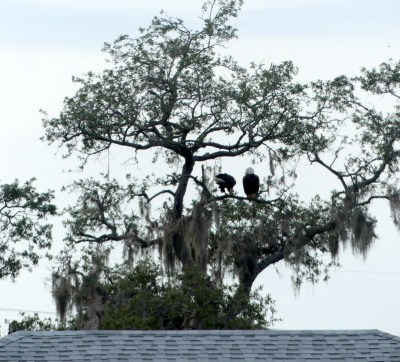 Bald Eagle. When a Bald Eagle fly to the top branches of a pond-shore tree the smaller birds fled, yielding to the eagle’s raptor reputation. All American patriots know the Bald Eagle, our national bird. The heads and necks (of both male adults and female adults) are covered with bright white feathers, giving it the appearance of being “bald” (from a distance). [See John Bull & John Farrand, Jr., NATIONAL AUDUBON SOCIETY FIELD GUIDE TO NORTH AMERICAN BIRDS: EASTERN REGION, revised edition (New York, NY: Alfred A. Knopf, 1994), pages 321-322 & 423-424.] These heavy hawk-like raptors love to eat fish, so it is not surprising to see them at and near seashores, lakeshores, estuarial bays and riverbanks, and similar shorelines where fish are readily available. [See Roger Tory Peterson, PETERSON FIELD GUIDE TO BIRDS OF WESTERN NORTH AMERICA, 5th edition (Boston, MA: HarperCollins, 2020), page 178.]