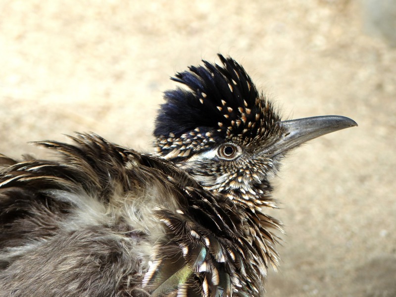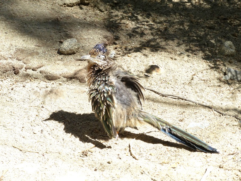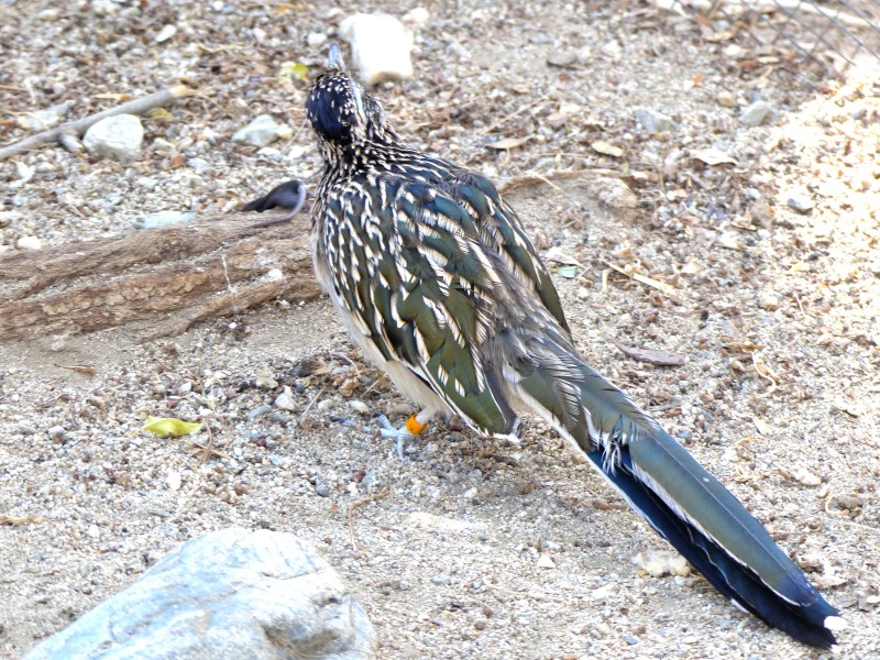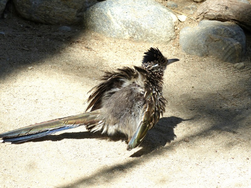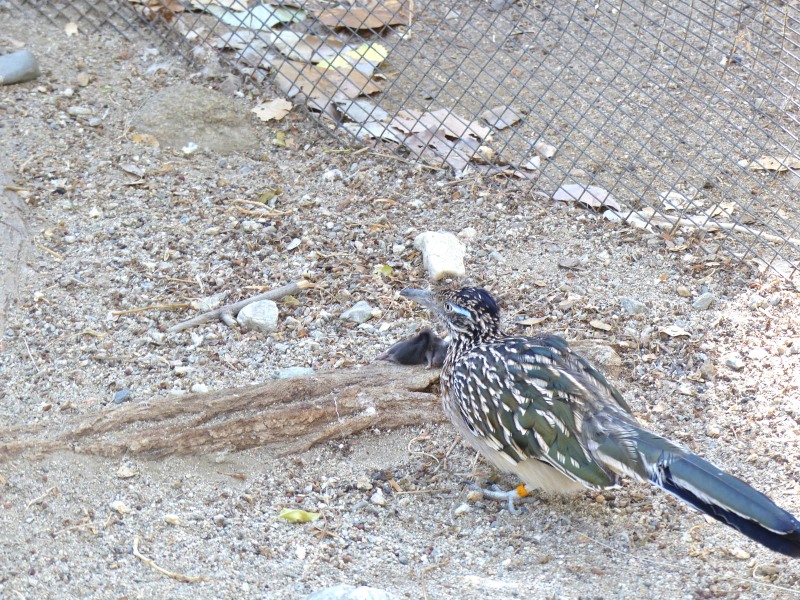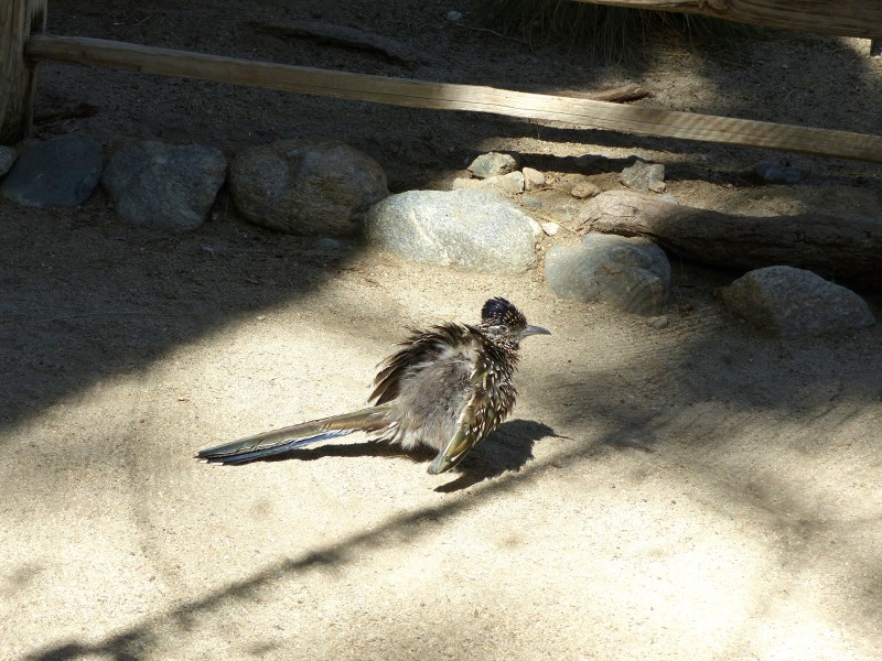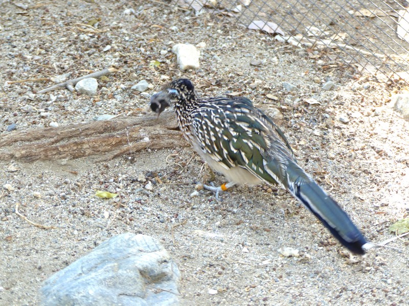 Well, “Paisano Pete” definitely would not count as a real bird, so I had to keep looking. We saw some in a Zoo or two, but when we got to the Living Desert Zoo in California, we were able to really see two of them. They were in an aviary where we saw them up close and not through a cage wire. These are the Greater Roadrunner (Geococcyx californianus). One was warming itself by exposing its feathers on the back and the other was trying to kill a dead mouse and chase a Turkey Vulture around. Got within two feet of one of them.