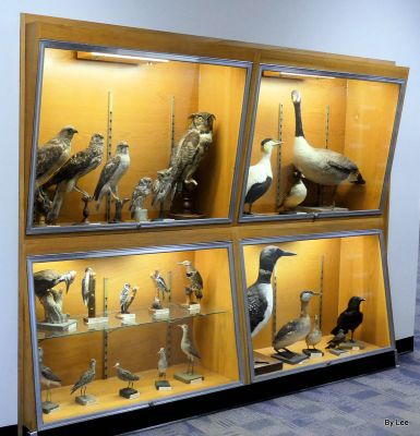 The next upper display case had Hawks and Owl specimen. The three Hawks give a size perspective of those hawks. The largest is the Red-Shouldered Hawk, then the Northern Harrier (female), and the Broad-Winged Hawk.