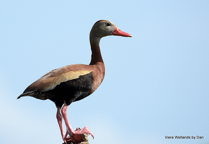 “In the family of waterfowl, the tropical whistling-ducks rank midway between geese and dabbling ducks. They are gooselike in appearance, with long necks and long legs; they graze grainfields, usually feeding at night. However their high-pitched whistling calls are typical of neither goose nor duck; and in flight, with necks and legs extended, they suggest a flock of ibises. Nesting colonies of the black-bellied whistling-duck occur in Texas, often around livestock water areas. When feeding in cornfields, they perch on mature stalks to glean the ears.” (Audubon Society Encyclopedia of North American Birds, Terres ,p214)