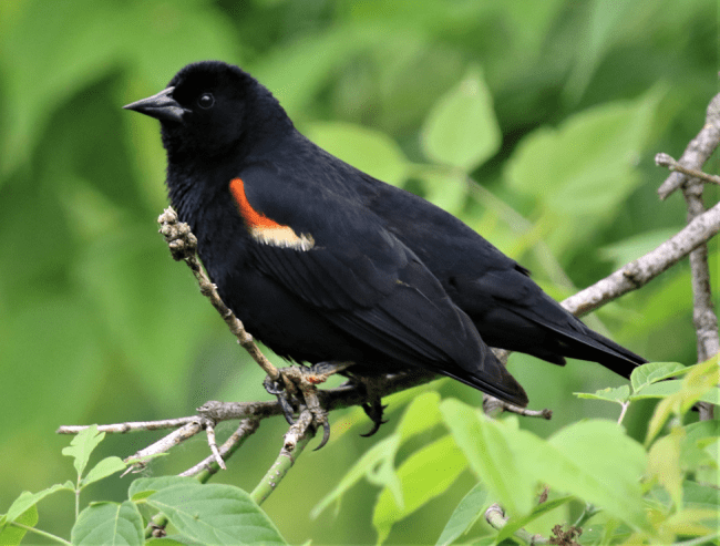 The yellow-headed blackbird and red-winged blackbird are often found in the same habitat in the western United States, but yellow-headed blackbirds [being robin-sized] are the larger, more dominant species. They generally nest in deeper water near the center of larger wetlands, while red-winged blackbirds nest along the edges in shallower water.