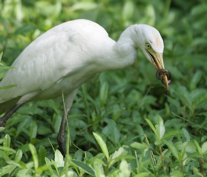 When cattle egrets tag along with cattle, whose quadrupedal movement through pastures (or non-agricultural grasslands) stir up insects or all kinds, the cattle egrets opportunistically snap up the dislodged bugs. Likewise, Cattle Egrets are not shy about perching atop cattle, to eat whatever insects or ticks (or insect larvae) may be trespassing on beleaguered bovine bodies.