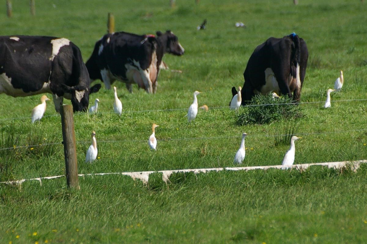 It should be no surprise that Cattle Egrets associate with cattle, picking (at and eating) bugs that pester those noble (and vulnerable) bovines.