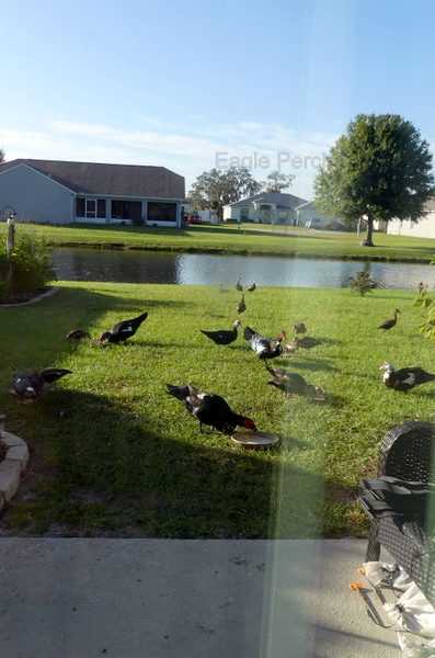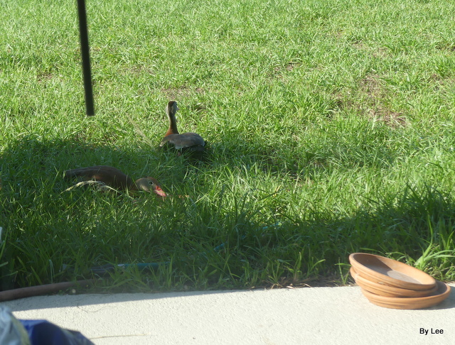 This morning our Whistling Duck pair came looking for food, as is becoming their routine. Dan was planning to mow the grass today, so the food dishes were empty and stacked on the patio. So, I put one close by and gave them some food.
