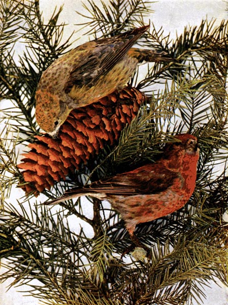 MERICAN CROSSBILLS are notable for their small size, being considered and described as dwarfs of the family. Their food consists exclusively of pine, fir, and larch, which accounts for the fact that they are more numerous in Northern latitudes where these trees abound. When the cones are abundant they visit in great numbers many places where they have not been for years, appearing at irregular intervals, and not confining themselves to particular localities. They are very social even during the nesting season. Their nests are built among the branches of the fir trees, and there they disport themselves gaily, climbing nimbly, and assisting their movements, as parrots do, with their beaks. They will hang downward for minutes clinging to a twig or cone, seeming to enjoy this apparently uncomfortable position. They fly rapidly, but never to a great distance. “The pleasure they experience in the society of their mates is often displayed by fluttering over the tops of the trees as they sing, after which they hover for a time, and then sink slowly to their perch. In the day time they are generally in motion, with the exception of a short time at noon. During the spring, summer and autumn they pass their time in flying from one plantation to another.”