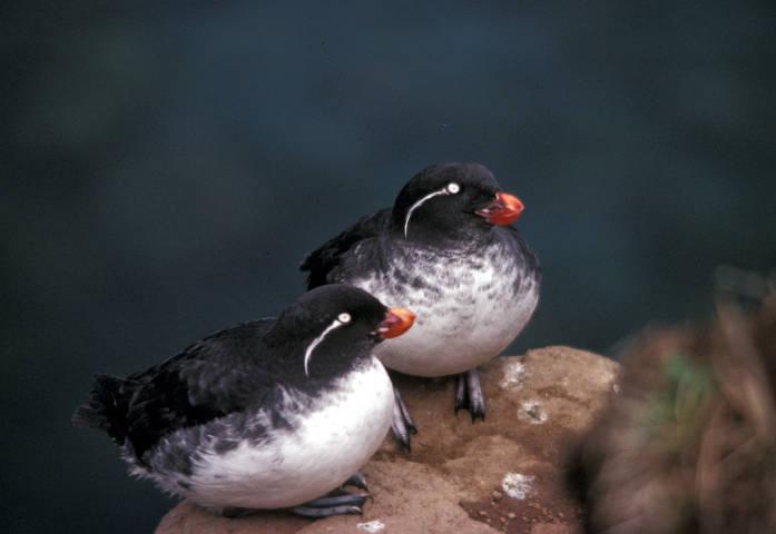 At sea Cassin’s Auklets feeds offshore, in clear often pelagic water, often associating with bathymetric landmarks such as underwater canyons and upwellings. Numbers at sea may be grossly underestimated because the bird moves away from ships at a distance of more than a kilometer. Recently their distribution around Triangle Island has been determined by telemetry. It feeds by diving underwater beating its wings for propulsion, hunting down large zooplankton, especially krill. It can dive to 30 m below the surface, and by some estimates 80 m