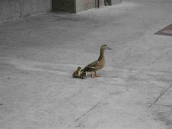 At one point a group of college students rushed to the door to get out of the rain. The family of ducks quickly followed behind them and stood in the building to dry off and get warm. Eventually the ducklings settled down to take a nap while the stormed died down. Several students watched the family of ducks and took some pictures until one of them opened the door to let them out when the storm passed. When they made it back outside, they all returned to the lake and settled back down on the grass. Eventually the ducklings grew to the point where they were able to fly south for the winter, and the entire family was safe and happy.