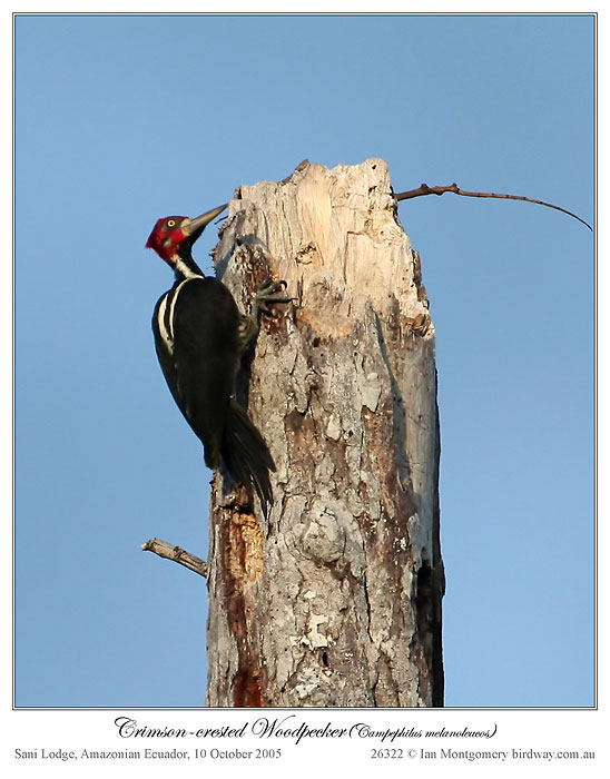 The Crimson-crested Woodpecker (Campephilus melanoleucos) is 36cm/14in in length and a close relative of the larger (at least 48cm/19in) and legendary, maybe-extinct-maybe-not Ivory-billed Woodpecker of the southern USA (Campephilus principalis) about which there was so much excitement in 2004-5. The Crimson-crested is happily quite common with a wide range in northern South America. Campephilus incidentally means ‘grub loving’ as this group of woodpeckers finds the larvae of wood-boring beetles to their liking.