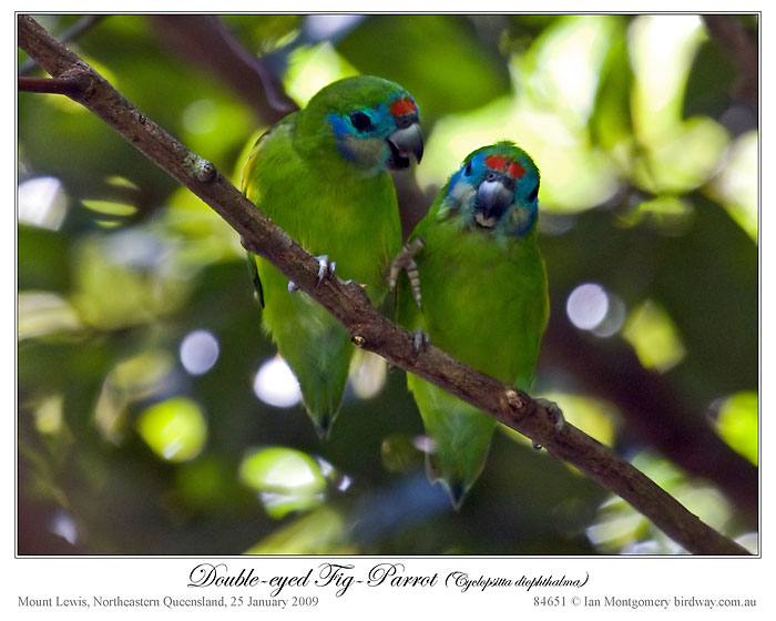 These three races were originally treated as separate species and known as Macleay’s or Red-browed, Coxen’s or Blue-browed and Marshall’s Fig-Parrots. Later they and five races in Papua New Guinea were lumped into a single species and acquired the common name of the nominate Double-eyed Fig-Parrot of PNG (Cyclopsitta diophthalma diophthalma). This has a dark spot near each eye, giving it its double-eyed appearance, but the name is not descriptive of the races that lack the dark spot, i.e. the three Australian races. Oh well, they got the fig bit right.