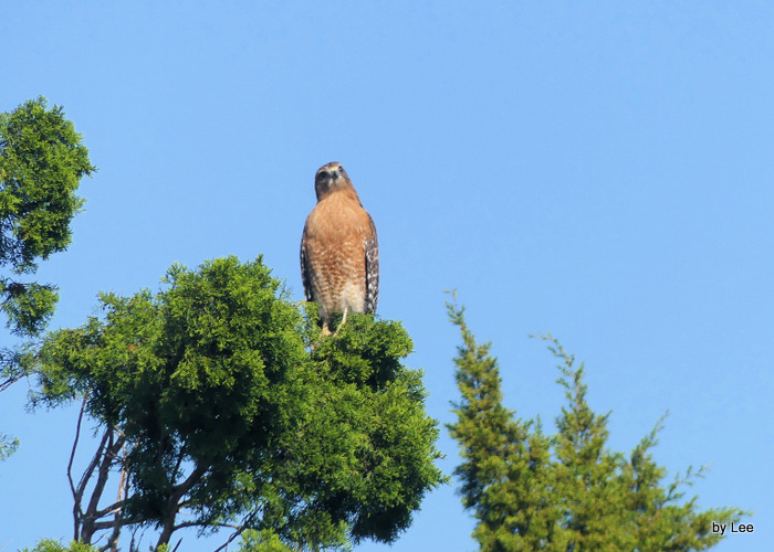Bald Eagle. When a Bald Eagle fly to the top branches of a pond-shore tree the smaller birds fled, yielding to the eagle’s raptor reputation. All American patriots know the Bald Eagle, our national bird. The heads and necks (of both male adults and female adults) are covered with bright white feathers, giving it the appearance of being “bald” (from a distance). [See John Bull & John Farrand, Jr., NATIONAL AUDUBON SOCIETY FIELD GUIDE TO NORTH AMERICAN BIRDS: EASTERN REGION, revised edition (New York, NY: Alfred A. Knopf, 1994), pages 321-322 & 423-424.] These heavy hawk-like raptors love to eat fish, so it is not surprising to see them at and near seashores, lakeshores, estuarial bays and riverbanks, and similar shorelines where fish are readily available. [See Roger Tory Peterson, PETERSON FIELD GUIDE TO BIRDS OF WESTERN NORTH AMERICA, 5th edition (Boston, MA: HarperCollins, 2020), page 178.]