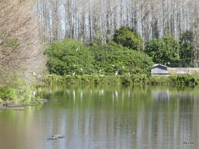 Today was a beautiful day for another trip over to Gatorland in Orlando, Florida. [About a 50 mile ride] It is still a bit early for the chicks to arrive, but some Great Egrets were nesting. It was a cloudless day, and from the next photo, you can see that there are plenty of birds in the distance on nest. Unfortunately, you cannot get very close to those.