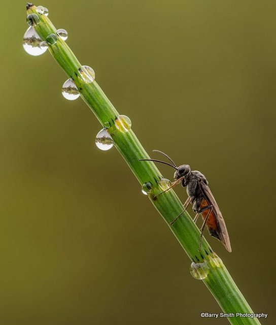Sawfly on Horsetail drinking dew Cornwall UK Drinking Dew ©Photography of B Smith