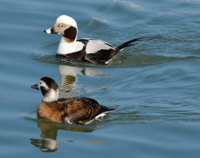 But political pressure intrudes into the mostly-apolitical ornithology neighborhood. It seems that the earlier common name for this duck, “Oldsquaw”, is now deemed unacceptable, because it might offend someone who stumbles on the terms “old” and “squaw”, as imagining disrespectful stereotypes of elderly tribeswomen. Although “P.C.” (i.e., political coërcion) pressures should not dictate taxonomy for ornithologists, there you have it—since the International Ornithologists’ Union has acted, so now all Oldsquaws are re-named “Long-tailed Ducks”! What a world!