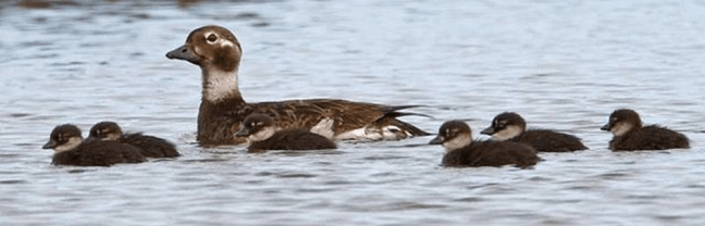 Long-tailed Duck mother with young (Wikipedia photo credit)