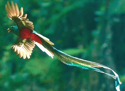 QUETZALS are fancy trogon-birds, sporting flamboyant colors and long streamer-tails. Latin American jungles and subtropical wet forests are habitats of Pavonine Quetzals, Crested Quetzals, Resplendent Quetzals, Golden-headed Quetzals, and White-tipped Quetzals. Eared Quetzals live near streams in Mexico’s pine-oak forests and canyons.