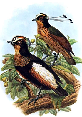 QUEEN CAROLA’S PAROTIA, also called “Queen Carola’s 6-wired Bird-of-Paradise”, are endemic (natively populated) only to New Guinea, the largest island in the Indonesian archipelago. Parotias are part of the bird-of-paradise family, and like their cousins, they perform histrionic ballet-like dances (called “leks”) upon forest dance-floors (flat areas of forest floor swept clean of loose vegetation and debris). In such dances the male hops around and bobs his crest-feathered head, like a bobble-head toy, puffing his chest plumage, fluttering his wings, fanning his kilt-like feathers, and other enthusiastic displays of “showing off for the girls”.