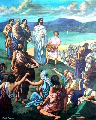 (19) And he commanded the multitude to sit down on the grass, and took the five loaves, and the two fishes, and looking up to heaven, he blessed, and brake, and gave the loaves to his disciples, and the disciples to the multitude.