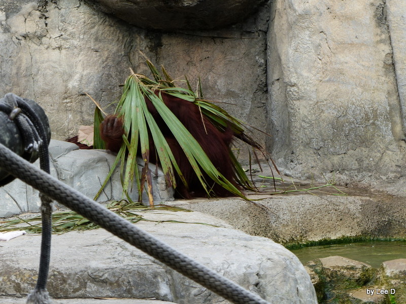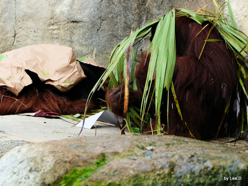 A new Orangutan was born on December 21st and hoped to see the little one, but Momma had different plans. She was laying with the baby between her and her big arm and had a piece of cardboard over her. Her mate was nearby with leaves over his head. (This is normal for these at this zoo.)