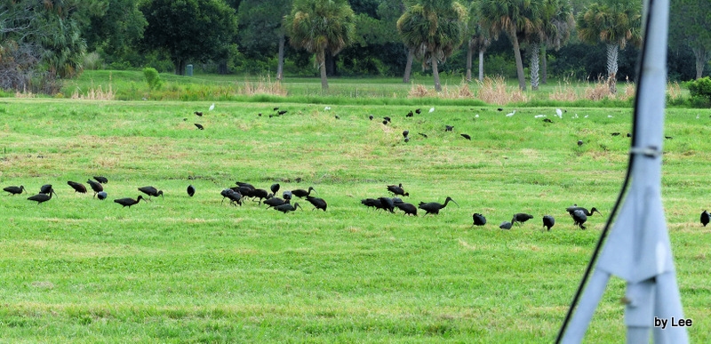 Not far past them, we arrived where the Ibises had been and sure enough, they were waiting for us. My thinking is that they were on their way somewhere, in migration, and had landed to rest and feed. Possible to avoid a coming storm. Right after these photos were taken, we got soaked by a rainstorm as we were entering the commissary (Grocery).
