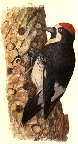 Carpentering is both his profession and his pastime, and he seems really to enjoy the work. When there is nothing more pressing to be done, he spends his time tinkering around, fitting acorns into holes in such great numbers and in so workmanlike a fashion that we do not know which is more remarkable, his patience or his skill. Every acorn is fitted into a separate hole made purposely for it, every one is placed butt end out and is driven in flush with the surface, so that a much frequented tree often appears as if studded with ornamental nails. “What an industrious bird!” we exclaim; but still it takes some time to appreciate how enormous is the labor of the Carpenter. Whole trees will sometimes be covered with his work, until a single tree has thousands of acorns bedded into its bark so neatly and tightly that no other creature can remove them.