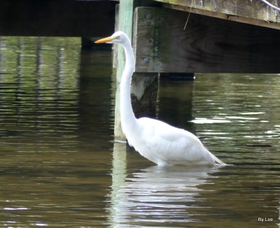 I was then off to the lagoon or pond, whatever they call it, to see what the birds and gators were up to. Compared to other times, it was rather quite, except for a Great Egret strolling out from under the boardwalk: