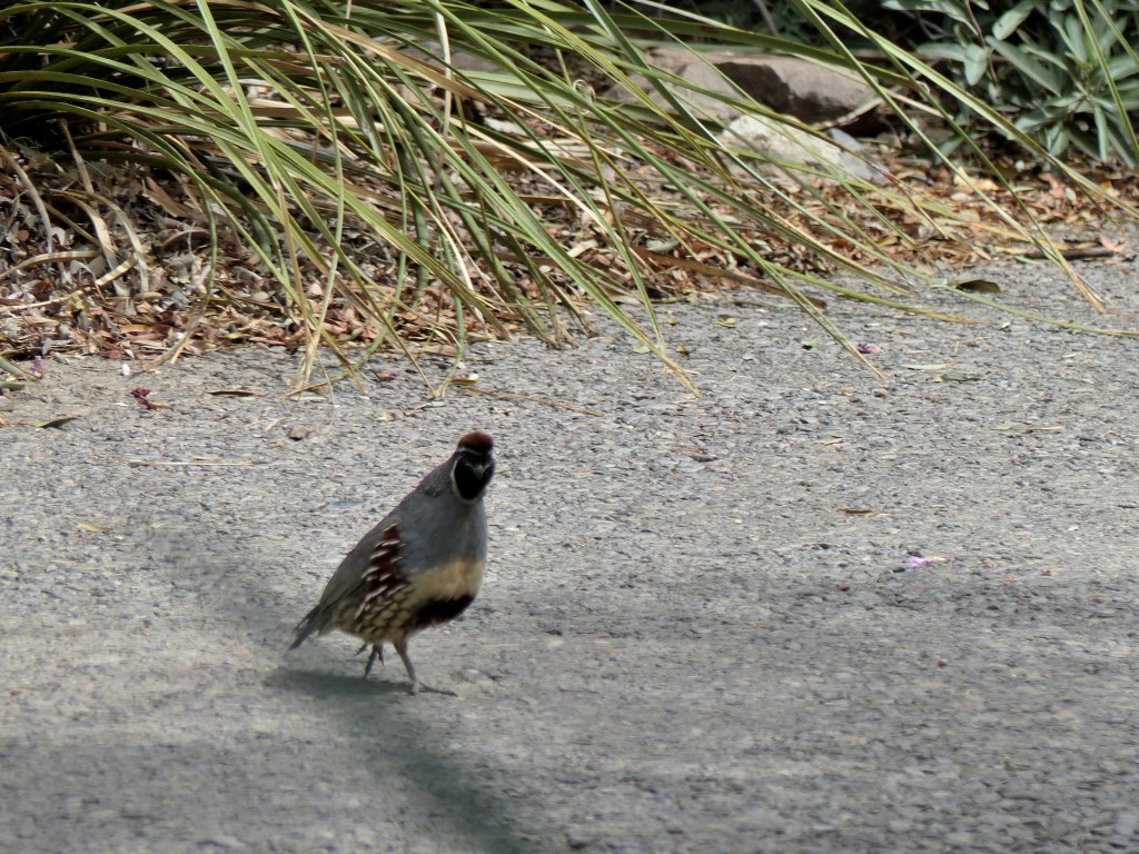 Those western quails like to parade around like they are Royalty. Not really, but they are cute with that bobbing curved topknot. It bobs because of the way they walk around putting their head up and down or “bobbing”.