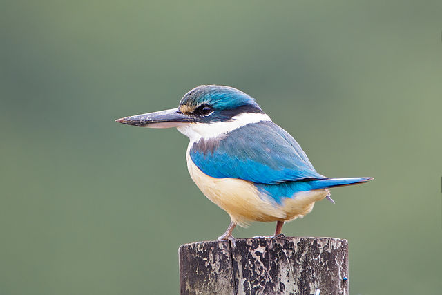The sacred kingfisher is a medium-sized kingfisher. They are mostly turquoise, with white underparts and collar feathers. Both sexes are similar, but females are usually more dull-colored. Juveniles have rusty-brown edges on the collar and underparts.