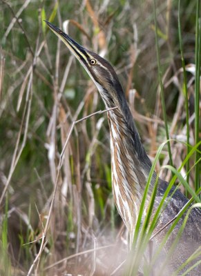 But we can’t be blamed. A prominent ornithology website says, “You’ll need sharp eyes to catch sight of an American Bittern. This streaky, brown and buff heron can materialize among the reeds, and disappear as quickly, especially when striking a concealment pose with neck stretched and bill pointed skyward.” With his bill pointed upward, our bittern blended in perfectly with the tall brown grasses that lined the water’s edge. Again, perfectly hidden in plain sight.
