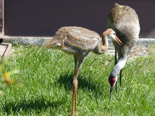“Sandhill breeding habitat is marshes and bogs in central and northern Canada, Alaska, part of the midwestern and southeastern United States, Siberia and Cuba. They nest in marsh vegetation or on the ground close to water. The female lays two eggs on a mound of vegetation, but it is rare that both chicks hatch and grow to independence. Cranes mate for life; both parents feed the young, calledcolts“, who are soon able to feed themselves. The colts are taught to fly over many weeks when they run and dance with their parents. Dancing is a significant component in the education of young cranes. The Sandhill Crane does not breed until it is two to seven years old, and the average generation time is 12.5 years. It can live up to 25 years in the wild; in captivity it has been known to live more than twice that span. Mated pairs stay together year-round and migrate south as a group with their offspring.” (Wikipedia) This pair is here year-round. Been in our backyard many times.