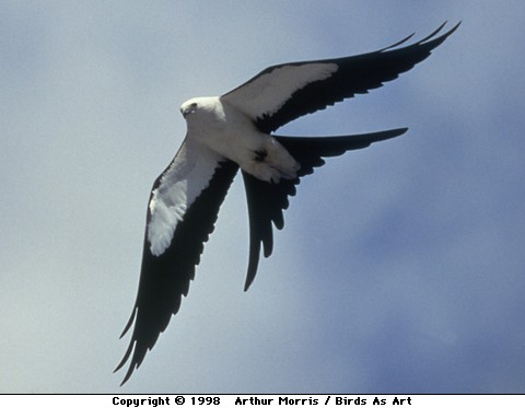 Miscellaneous notes; Occasionally nest in loose colonies of a few pairs. Bathe and drink by skimming water surface like swallow. Occasionally soar at great heights. Up to 200 pieces used in nest, carried individually, may require up to 800 miles of flight. Formerly known as American Swallow-tailed Kite; changed by AOU in 1996.