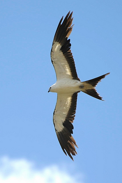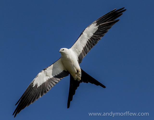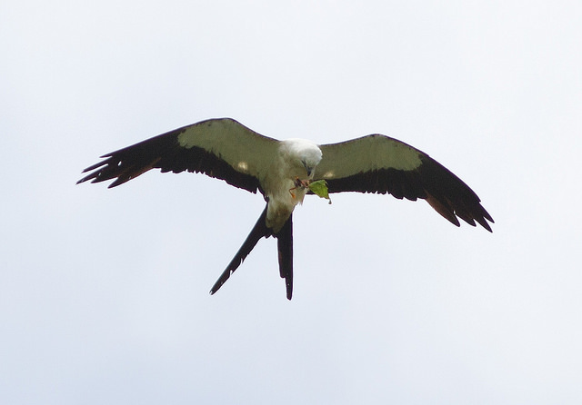 Here is how All About Birds describe them: “The lilting Swallow-tailed Kite has been called “the coolest bird on the planet.” With its deeply forked tail and bold black-and-white plumage, it is unmistakable in the summer skies above swamps of the Southeast. Flying with barely a wingbeat and maneuvering with twists of its incredible tail, it chases dragonflies or plucks frogs, lizards, snakes, and nestling birds from tree branches. After rearing its young in a treetop nest, the kite migrates to wintering grounds in South America.” (emphasis mine)