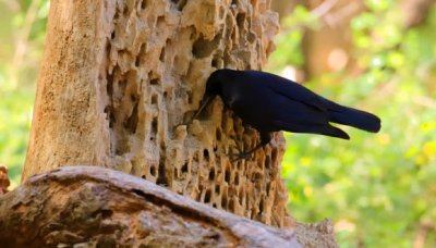 On one particular day, one of the crows named Oliver flew to a tree trunk to search for food. Oliver carefully ripped off a piece of a plant to scoop out some worms from the trunk. In order to scrape the worms out, Oliver bit the strip of the plant with his beak to give the side of it a sharp, jagged edge. After pulling out the worms, Oliver grabbed them in his beak and made ready to fly away.